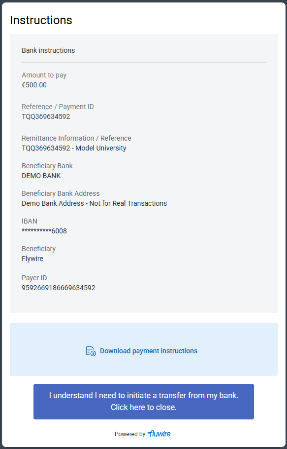 You can display the instructions on demand with the instructions element. The payer also has the option to download the instructions here.