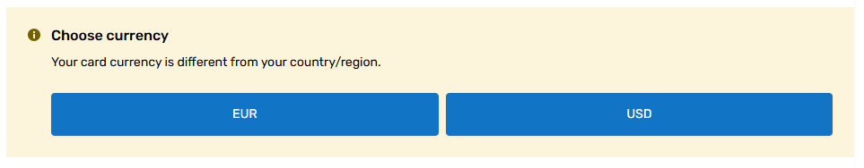 If the card currency doesn't match the currency of the payer's country, and if there is an option to pay in either of them, the payer can choose which currency they want to pay in. They have two options: The currency of the card they are paying with and the currency of the country they have chosen for their address.