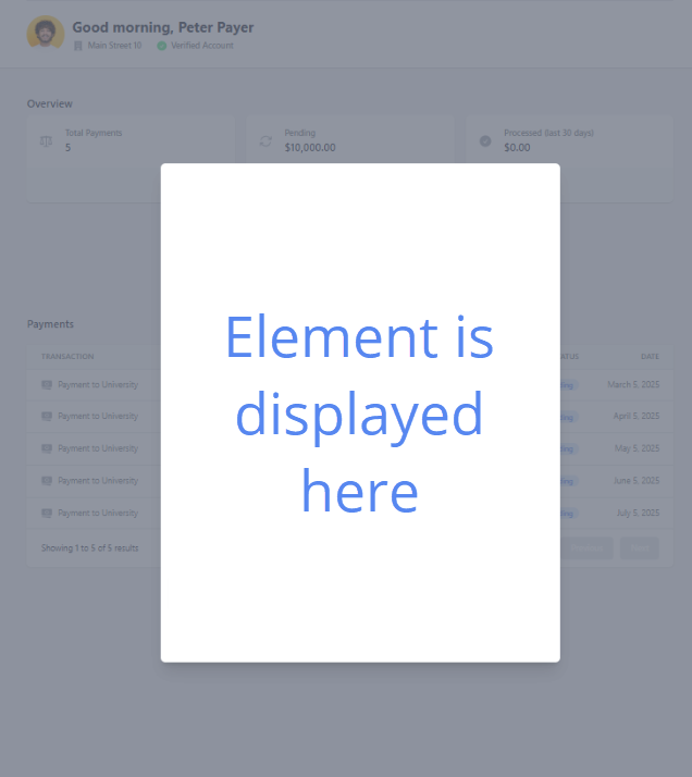 Bank Transfer Instructions This is a read-only element that displays the bank transfer instructions to the payer. It must be used in conjunction with the bank transfer payment element. How is this element used? The bank transfer payment element automatically shows the instructions to the payer. To make is easier for your payer to access this information at a later point, you can display the instructions again with this element. To be able to make a bank transfer payment, it is crucial that the payer has access to the bank transfer instructions. There are multiple options for the payer to access the information: