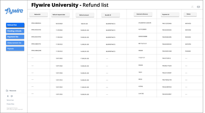Flywire processes refunds collectively in refund bundles to streamline the reconciliation process. Bundling refunds means Flywire only needs to collect money from the original payment recipient once, reducing the number of transactions needed for refunds.