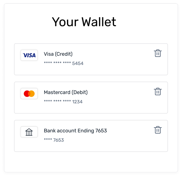 Deleting payment methods To enable your payer to delete their payment methods in their wallet, use Deleting a Payment Method for a Payer. |