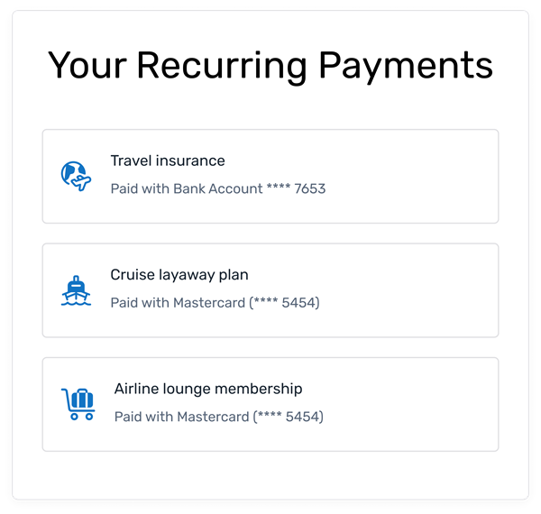You can give your payer an overview about which card or bank account is connected to which payments. To display this mapping, you need to look up all mandate IDs (= the purpose of the payments) for the token that identifies the payment method, see Getting the Mandate IDs for a Payment Method Token.